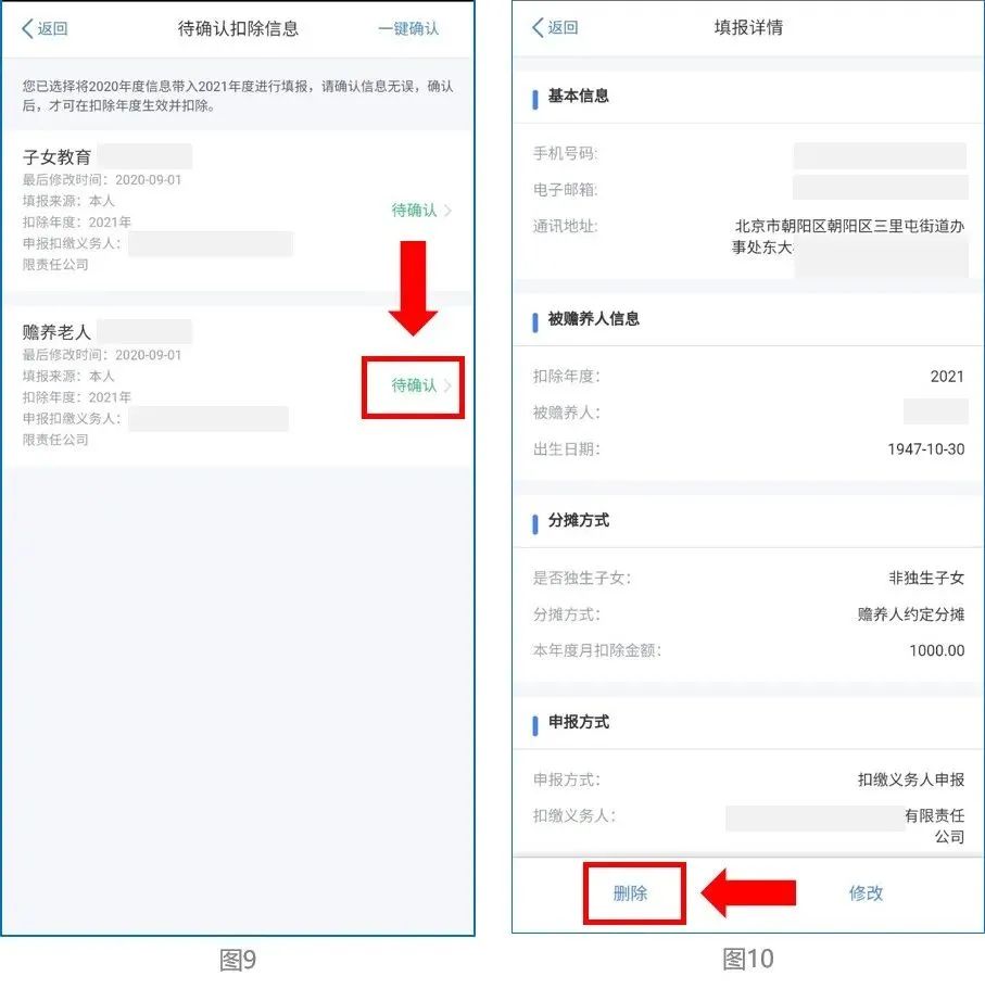 点击“待确认”状态的赡养老人信息,点击“删除”,再点击“一键确认”。