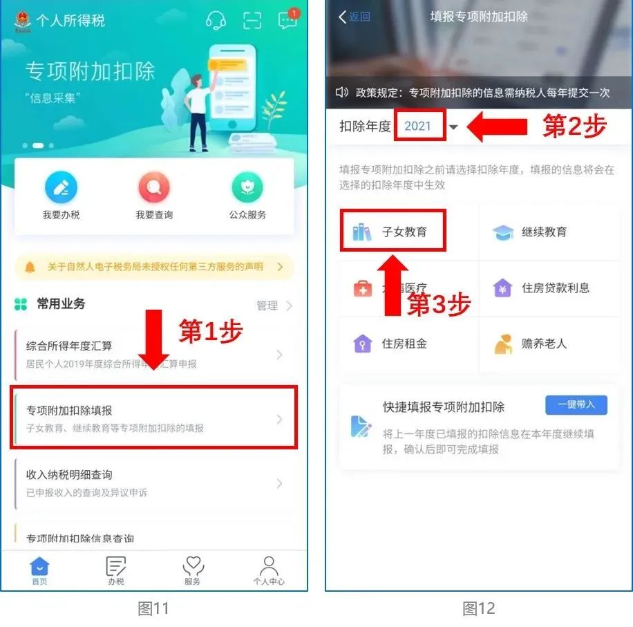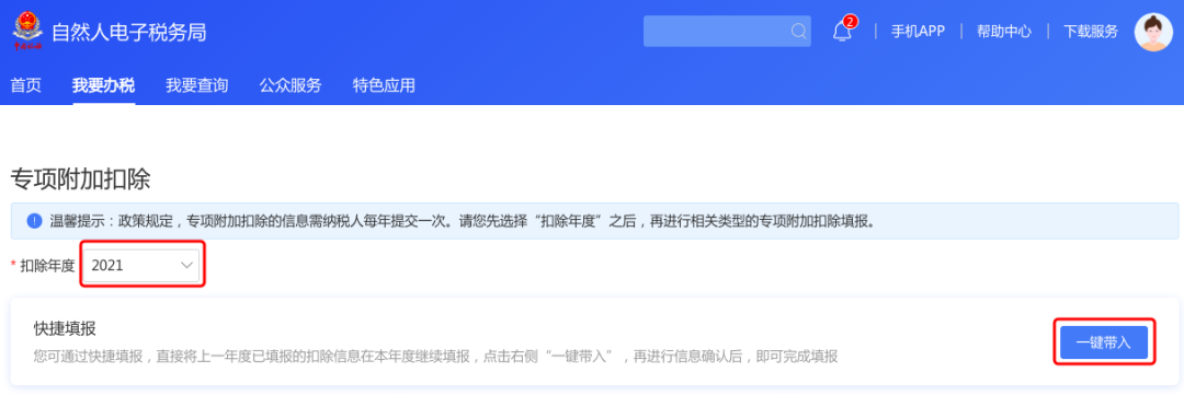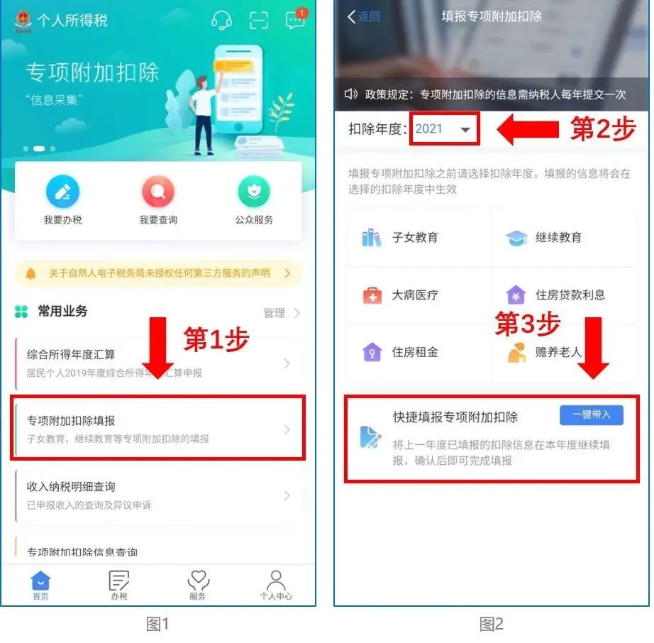 ①打开个人所得税APP-首页-“专项附加扣除填报”-选择“扣除年度”-“一键带入”;