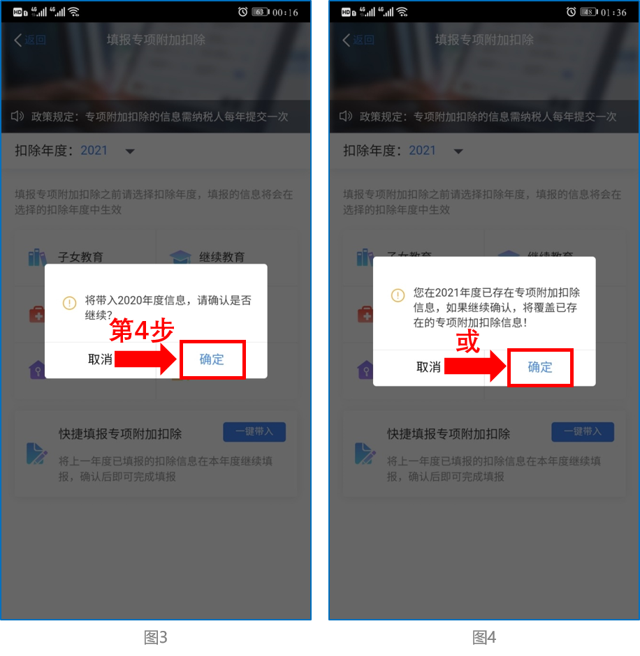 ②依据提示“将带入2020年度信息,请确认是否继续?”或者“您在2021年度已存在专项附加扣除信息,如果继续确认,将覆盖已存在的专项附加扣除信息!”确认后点击“确定”;