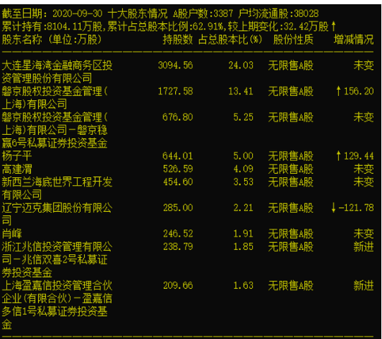 磐京基金最早在2019年中报就进入了大连圣亚的十大流通股东名列,当时持股375.5万股,持股占比2.92%。到了2019年三季报,磐京基金及磐京稳赢6号双双进入十大股东名列。
