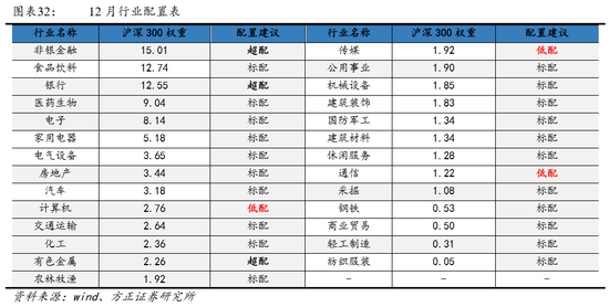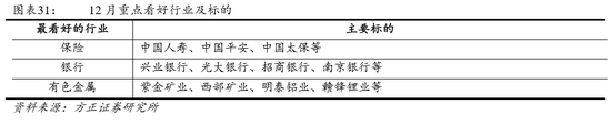 行业配置的主要思路:复苏延续,买入价值。11月上证综指呈现缓慢上行趋势,并且自9月以来首次站上3400点,其中,有色金属、钢铁、采掘、汽车、银行等顺周期板块领涨,医药、传媒、计算机等消费成长板块领跌。从经济环境、政策环境、以及估值性价比来看,市场风格已经由成长消费转向顺周期。从行业配置角度看,12月,国内经济与货币政策环境维持友好,指数在权重股带动下或将继续震荡冲高,市场仍存在结构性机会。首先,经济数据向好反映国内经济复苏动能延续,经济复苏逻辑下,周期行业业绩拐点叠加估值低位,价值风格行情有望延续。1-10月工业企业利润同比增长0.7%,前值-2.4%,年内首次转正,其中10月同比增速跃升至28.2%,经济数据维持向好态势,有助提振市场。其次,货币政策层面维持友好,短期或难有进一步收紧,流动性对A股估值的整体压制或将减弱,前期回调较深且政策影响行业中长期景气度上行的方向或存在配置机会。央行发布的《三季度货币政策执行报告》指出下一阶段既要保持流动性合理充裕,不让市场缺钱,又坚决不搞“大水漫灌”,不让市场的钱溢出来,整体保持相对稳定状态。我们认为,货币政策退出将是渐进式的,社融或在年内见顶,但短期内无风险利率难以进一步上行,这意味着A股结构性行情仍将继续。整体来看,复苏逻辑仍将是短期内市场主线,大金融板块有望拉升指数表现,中期关注十四五规划中受益行业。我们建议从两个维度择优布局,一是顺周期维度,包括耐用消费(汽车、家电等)、金融(银行、非银)、强周期品(有色、化工等)。二是新兴产业,偏科技成长属性,如5G、新能源汽车、数字经济。12月首选行业保险、银行、有色金属。