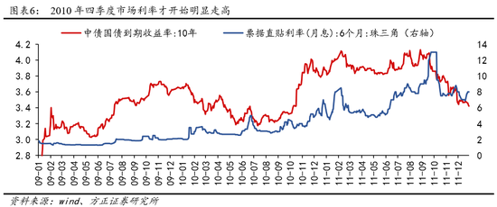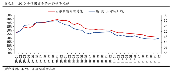 2010年货币政策释放从紧信号,货币信用保持宽松,各项利率直至四季度紧缩加码之后才明显抬升。2010年货币政策处于紧缩的开端,在四季度通胀抬头后陡然加码。2010年一季度经济增速明显过高,货币政策在2010年开始试探性紧缩,标志是1月18日央行上调存款准备金率,政策超预期早调。随后央行在上半年于2月和5月再上调两次存款准备金率。5月开始欧债危机出现蔓延,5-7月经济数据偏弱,7月温总理在调研时释放政策由压转保的信号,货币政策紧缩放缓。随着经济数据企稳、四季度通胀连续破4破5、美国QE2预期强化加剧通胀担忧,10月份开始央行紧缩政策陡然加码,随着10月20日央行加息,四季度央行加息两次,上调存款准备率3次。全年加息两次,上调存款准备金六次,货币政策在前三季度总体处于紧缩的开端,较为温和,在四季度陡然加码。流动性方面,从社融来看,2010年社融规模同2009年的天量社融基本持平,融资需求旺盛;从货币供应量来看,2010年全年M2增速前高后低,由年初的26%下移至年底的20%,全年维持在较高水平;从各项利率水平来看,十年期国债收益率在前三季度持续下行,仅在四季度货币政策密集加码之后才快速走高,票据直贴利率也是在四季度才明显走高。总体而言,四万亿刺激之后,虽然2010年货币政策开始收紧,但2010年流动性仍然保持较为充裕的状态。
