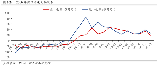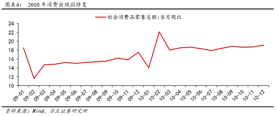 2010年经济周期位于V型反转后的高位企稳阶段。2010年全年经济基本延续了2009年以来的复苏趋势,在四万亿的刺激下,GDP增速在2009年逐季攀升。受到基数因素影响,经济增速在2010Q1达到峰值(12.2%),随后虽有所下滑但基本保持在10%左右的增速,全年增速达到10.6%。从经济的驱动力来看,出口在金融危机担忧消除后大幅改善,由2009年底的-16%反弹至2010年底的31.3%;地产投资再上台阶,弥补了基建投资增速下滑的空缺,制造业投资则基本持平,维持在26%左右的增速;消费增速出现弱修复。总体而言,2010年经济改善的驱动力来自于外需以及地产投资,整体呈现高位企稳的特征,四万亿刺激之后经济V型反转,在2010年全年维持较为繁荣的格局。2010年之后,经济增速开始逐级下行,告别了2002年以来10%的高速增长中枢,经济换挡降速的特征愈发明显,2010年第二产业对GDP增长的贡献率达到峰值,意味着中国经济依靠重化工业驱动的模式达到顶峰。