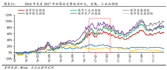 全球经济共振拉动商品价格上行,国海证券事件叠加货币政策紧缩冲击债市,业绩优势驱动白酒家电代表的白马蓝筹跑赢市场。2016年末至2017年初商品表现最优的核心逻辑是在全球经济同步复苏的背景下商品价格出现明显上涨。受益于美国基建刺激下的投资回暖、欧洲投资和出口的弱修复以及中国2014-2015年前序政策的强刺激,全球经济在2016-2017年共振向上,摩根大通全球综合PMI在经历超过两年的震荡下行后于2016年下半年开始回升,全球贸易增速在2017年同样出现明显反弹。全球经济的复苏提振了对大宗商品的需求,能源、金属商品价格持续走高。具体来看,国际定价的铜、石油价格均从2016年初触底回升,由于前期涨幅较大,2016年末至2017年初铜与石油价格基本保持稳定;螺纹钢价格也几乎从2016年初开始反弹,且受益于国内供给侧改革成效的显现,2017年初螺纹钢价格上涨接近16%。债券方面,这一时期十债收益率的走势主要受国海证券“萝卜章”事件和货币政策由松转紧的影响,总体保持上行趋势。2016年12月国海事件的爆发加速了无风险利率的上行,事件爆发后的五个交易日内十年国债收益率上升幅度高达19个基点,这一时期也被债券投资者称为“债灾”。在国海事件出现转机后,2016年底债券市场得到修复性上涨,但由于进入2017年1月后货币政策的明显转向,十年国债收益率重新回到上行通道。股市方面,流动性不断收紧的背景下业绩成为支撑股价的主要因素,而业绩具有优势的蓝筹白马股在这一时期领涨,价值跑赢成长,结构性行情持续演绎。具体来看,食品饮料与家用电器业绩增速的相对优势以及稳定的业绩输出支撑消费领跑,而钢铁、建材、交运等周期行业主要受益于供给侧改革成效的显现,业绩出现明显回升。