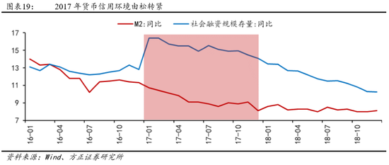 2017年货币信用环境由松转紧,在金融强监管的背景下流动性一阶拐点确立。2017年Q1货币政策处于紧缩的起点,并在Q4陡然加码,随即流动性一阶拐点确立。从2017年前后的政策基调看,货币政策采取循序渐进式的收紧,大致可分为两个阶段。第一阶段从2017年1月至4月,在2016年下半年金融去杠杆的意图逐渐明朗后,进入2017年之后货币政策收紧愈演愈烈,央行在2017年1-3月累计上调MLF、SLF和逆回购中标利率20个基点,2-3月连续两个月在公开市场回笼资金,宣告着货币政策目标的由松转紧。与此同时,3月底由银监会发起的“三三四”专项整治行动拉开序幕、MPA考核开启,银行业监管风暴来临,使得银行间市场流动性日益趋紧。第二阶段开始于2017年11月,资管新规征求意见稿的发布标志着货币信用环境的全面收紧,同时流动性一阶拐点确立。资管新规中打破刚性兑付、规范非标业务、严打资金池、统一产品杠杆等举措的提出使市场对未来流动性“硬着陆”的担忧不断加剧。此外,央行在2017年12月继续上调MLF、SLF和逆回购中标利率5个基点,从2017年12月起连续四个月在公开市场回笼资金,货币政策紧缩陡然加码。流动性方面,从各项利率水平看,2017年全年十债利率单边上行,并于年底见顶,票据直贴利率同样在12月底达到阶段新高。从货币供应量看,2017年M2增速单边下行,从年初的10.7%一路下行至年底的8.1%,体现了金融强监管、去杠杆、去通道的结果。从社融看,社融增速在2017年1月达到高点后开始逐渐下行,主要原因在于口径的调整,在11月金融去杠杆举措加码后信用开始全面收紧,市场真正进入“紧货币+紧信用”组合阶段。