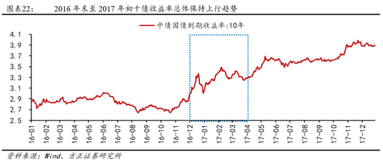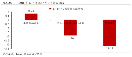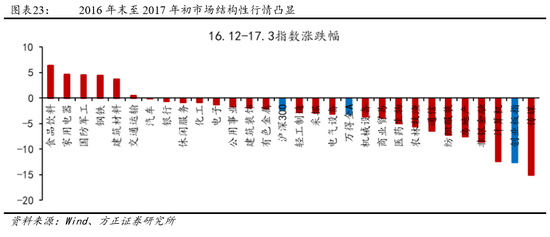 从大类资产表现看,2016年末至2017年初商品表现优于债券,债券表现略优于股票。商品方面,南华商品指数从2016年12月至2017年3月小幅上涨0.74%,成为这一阶段唯一取得正收益的大类资产。具体来看,商品细分品种走势分化,金属、工业品表现最优,涨幅分别为7.88%和3.81%,贵金属、能化同样小幅跑赢南华商品指数,农产品表现最差,同期跌幅接近7%。此外,相比之前商品单边上涨的走势,这一时期商品波动明显加大,核心逻辑是在经济向好的背景下,局部性、结构性的需求旺盛导致商品在短期内供需失衡的情况出现。债券方面,2016年12月至2017年3月中债总财富指数下跌1.86%,无风险利率在此期间总体保持上行趋势,走势可以大致划分为两个阶段。第一阶段从12月1日至31日,在国海证券“萝卜章”事件爆发的背景下十债收益率快速从1日的2.99%上行至20日的3.37%,随后由于国海事件得到妥善解决,十债收益率下降幅度高达36个基点;第二阶段从2017年1月至3月,十年国债收益率重新回到上行通道,从年初的3.01%上行至2月3.49%的高点后保持高位震荡。股市方面,市场出现明显分化,万得全A同期下跌3.18%,沪深300小幅下行2.32%,而创业板指则出现12.63%的大幅下跌。从行业看,申万一级行业中有6个行业同期收涨,结构性行情凸显,在大盘下行的背景下市场依旧存在一定的赚钱效应。具体来看,同属消费的食品饮料、家用电器领涨,涨幅分别为6.36%、4.59%。此外,国防军工、钢铁、建筑材料、交通运输在这一时期同样存在绝对收益。总的来说,在2016年末至2017年初的行情里,商品保持高位波动,债券从大幅回调进入震荡盘整,股票结构性行情凸显。