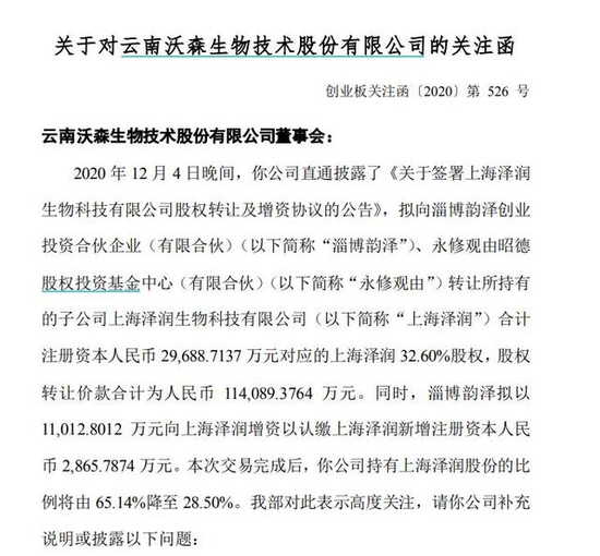 12月6日,深交所发出《关于对云南沃森生物技术股份有限公司的关注函》,表示对《关于签署上海泽润生物科技有限公司股权转让及增资协议的公告》高度关注,要求沃森生物(300142.SZ)董事会补充说明或披露17个相关问题。