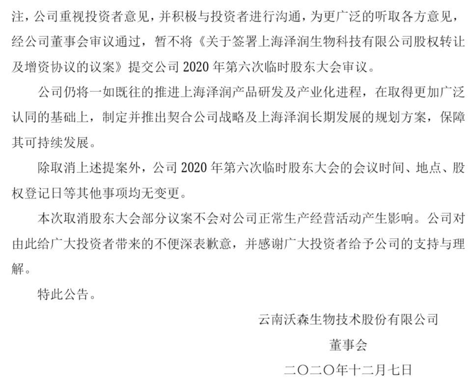 沃森生物董事会关注到投资者的情绪,感觉有必要进一步加强与各方之间的沟通,增进投资者对公司战略目标、经营决策和重大事项的了解。在坚定自身战略方向的同时,也要广泛征求、充分听取并尊重股东的意见。由此,沃森生物董事会形成决议,暂不将《关于签署上海泽润生物科技有限公司股权转让及增资协议的议案》提交公司2020年第六次临时股东大会审议。公司仍将一如既往的推进上海泽润产品研发和产业化进程,在取得更加广泛认同的基础上,制定并推出契合公司战略及上海泽润长远发展的规划方案,保障其可持续发展。