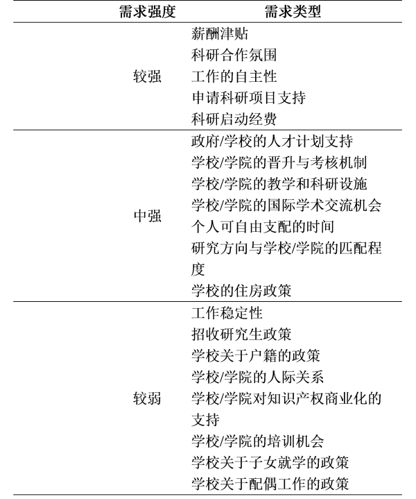 强度排序靠后的个体需求是与家庭相关的,包括子女就学、配偶工作的政策安排。较强需求有5项,包括薪酬津贴、科研合作氛围、工作自主性、申请科研项目支持、科研启动经费;中等强度需求有7项,包括是否有人才计划支持、晋升与考核机制、教学与科研设施、国际学术交流机会、个人可自由支配时间、研究方向匹配程度、学校住房政策;较弱需求有8项,包括工作稳定性、研究生招生政策、落户政策等。