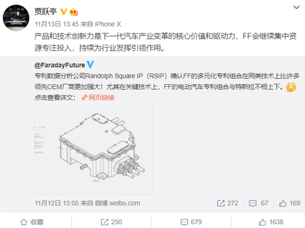 “专利数据分析公司Randolph Square IP(RSIP)确认FF的多元化专利组合在同类技术上比许多领先OEM厂商更加强大!尤其在关键技术上,FF的电动汽车专利组合与特斯拉不相上下。”