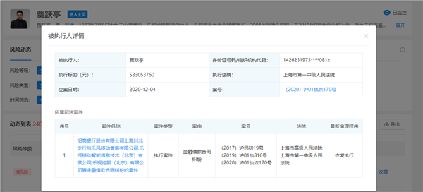 12月7日消息,据国内媒体报道,中国执行信息公开网显示,12月4日,贾跃亭被上海市第一中级人民法院列入被执行人名单,执行标的约5.33亿元,案号(2020)沪01执恢170号。