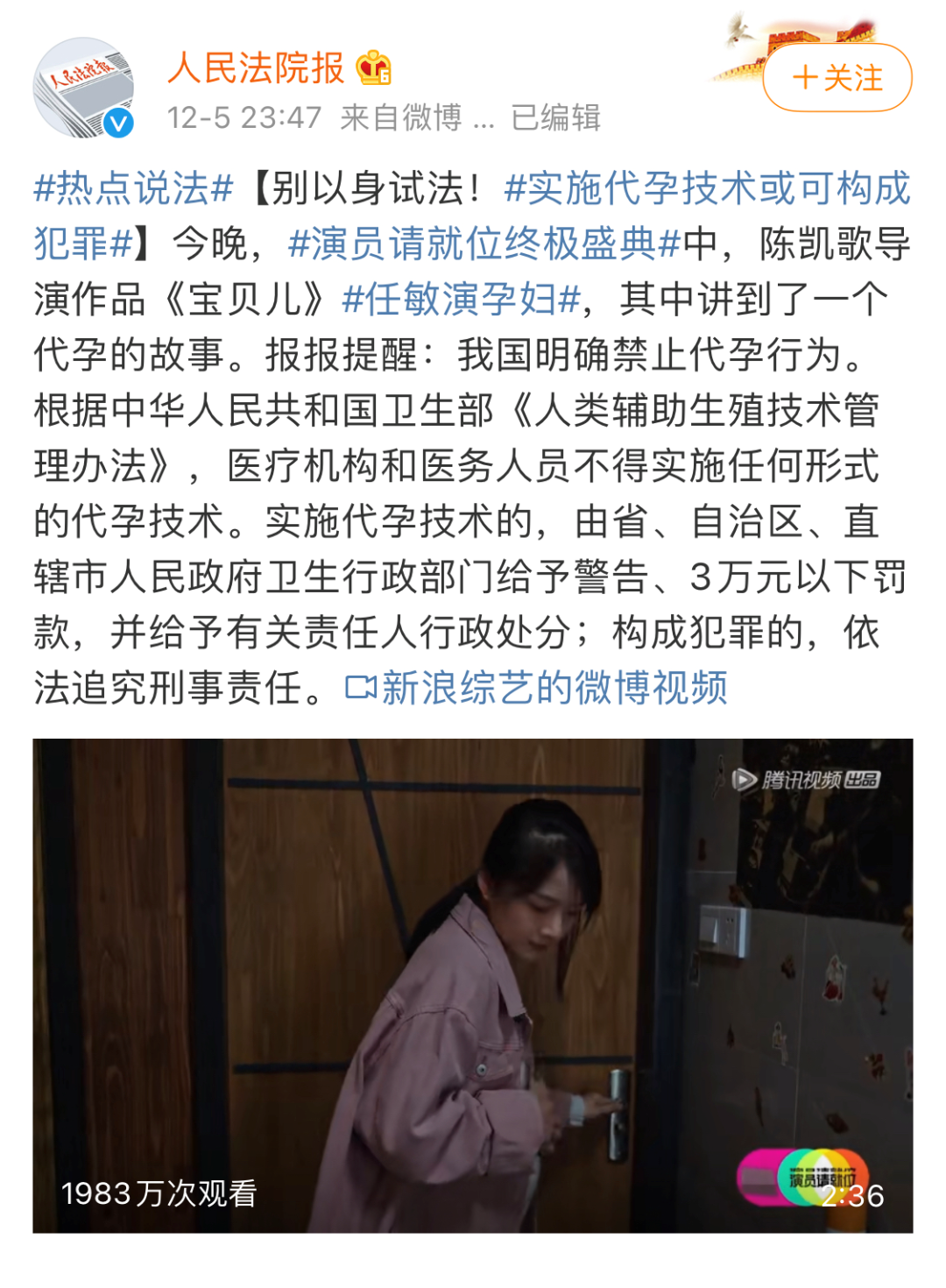 12月5日,某综艺节目中陈凯歌导演的作品《宝贝儿》被@人民法院报点名:“别以身试法!实施代孕技术或可构成犯罪”。