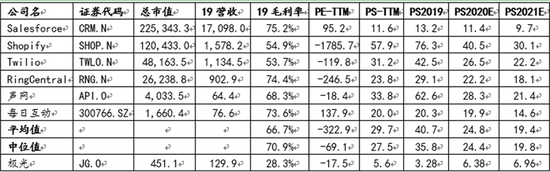 我们预计20-22年极光开发者服务(包括订阅服务和增值服务)收入增长率分别为86%、73%和74%,行业应用收入增长率分别为-28%、50%和43%,整体年化毛利率逐渐提升至44%、75%和78%,在21年即可实现扭亏为盈。极光的可比公司包括Salesforce、Shopify、Twilio等美股SAAS服务公司,以及A股的每日互动,美股市场对于SAAS服务的认可度远高于广告服务。以极光21年(出清精准营销业务后)预测收入4.275亿元人民币、行业平均19倍PS(2021E)估值,合理市值约12.3亿美元,对应股价为10.64美元/ADS。