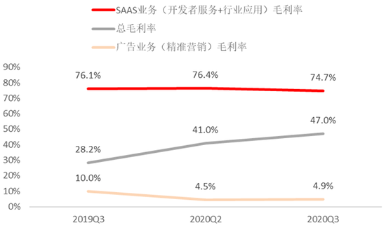 剥离精准营销业务后公司20Q3整体毛利率达到历史新高的47%,其中开发者服务和行业应用业务所组成的SAAS业务毛利率高达75%,精准营销的毛利润贡献几乎可以忽略。SaaS产品毛利率显著高于精准营销,因而这个战略性收缩收入规模实际上是十分明智的。