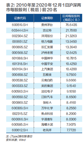 wind数据统计显示,2010年至2020年12月1日,在A股上市公司中,贵州茅台以933.84亿元的现金分红总额,位列第13位。同期,公司每股股利(税后,下同)为76.64元,高居两市榜首。