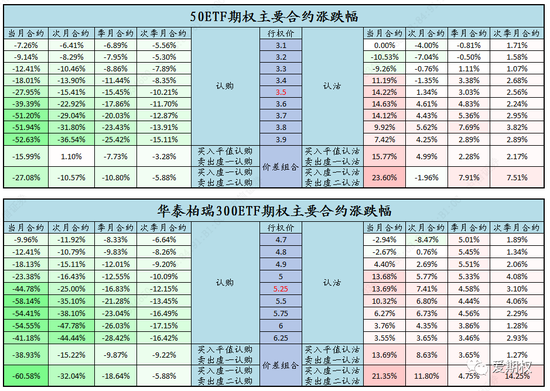 熊市价差组合表现最佳。今日认购期权价格普遍回落,部分虚值认购合约已将上周二市场大涨的盈利全部回吐,价格回落至接近上周一收盘价,这就是为什么上周二大涨后,我们说已获利后调仓止盈是一个稳妥布局市场继续上行的原因。认沽期权方面,今日受益于市场下跌普遍有所获利,但隐含波动率的下降使得其涨幅并不高,熊市价差组合如期表现最佳。