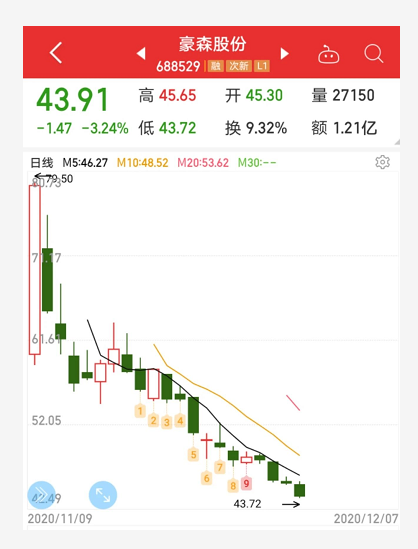 豪森股份11月9日登陆科创板,当日股价上涨291.58%,报79.1元/股。但上市次日,公司股价即开启了下跌模式,今日更是创新低,股价最低为43.72元/股,距离股价高点的79.5元/股跌幅已达到45.01%。