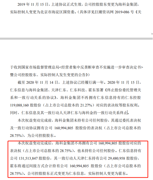 11月18日,仁东控股公告显示,原控股股东仁东信息及一致行动人与北京海淀科技金融资本控股集团股份有限公司(以下简称“海科金”)的表决权委托及一致行动协议终止。