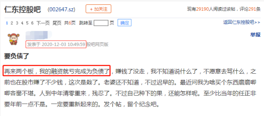 12月3日,一位参与仁东控股融资交易的投资者在仁东控股股吧表示,“再来两个跌停板,我的融资就亏完成为负债了”。