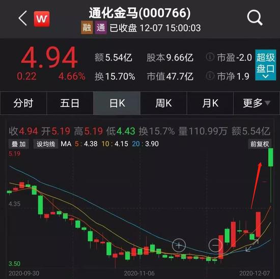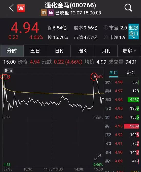 12月7日早盘,炒作熄火,通化金马开盘就从涨停价位快速下跌。盘中横盘一段时间之后,临近尾盘时,突然拉升至涨停,随即秒炸。截至收盘时,通化金马的涨幅收窄至4.66%。
