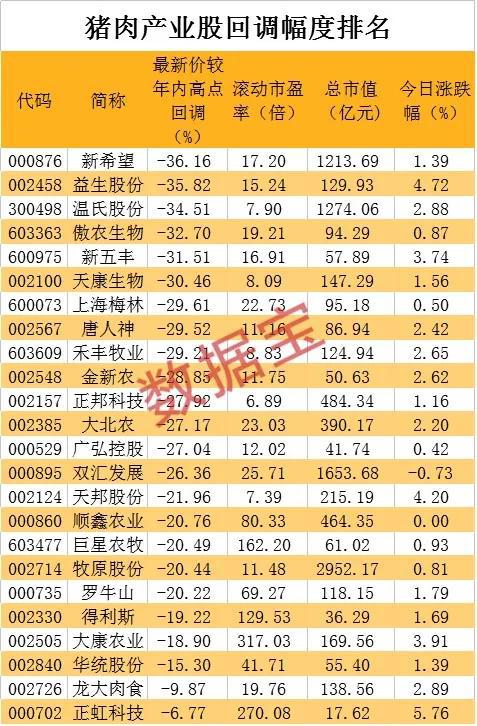 目前,A股猪产业个股总计24只,以最新价较年内高点来看,新希望、益生股份、温氏股份等6只个股回调幅度超30%,上海梅林、唐人神等13只个股回调幅度超20%,其中,养猪龙头牧原股份回调幅度达到20%,最新市值跌破3000亿元。