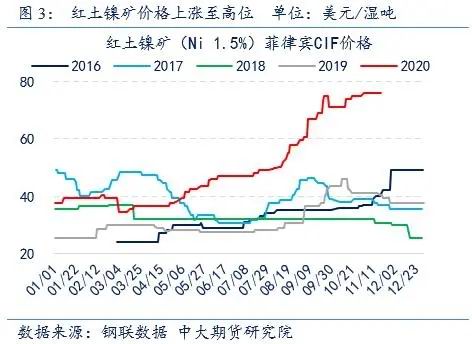在镍矿的供应上,国内硫化镍矿生产相对稳定,不过进口红土镍矿受主产国菲律宾雨季影响下滑显著。菲律宾11月遭受多个台风侵袭,雨季使得矿山作业效率低下,菲整体镍矿出货量及装船周期均受较大影响。并且由于近期中国自印尼煤炭用船需求增长,致使菲律宾用船相对紧张,中菲海运费回升至10-11美元/湿吨。在镍矿供应减少且海运费上涨的情况下,我国进口镍矿价格居高不下,截至11月24日,菲律宾品位1.5%的红土镍矿CIF价格为76美元/湿吨,较10月继续微幅上涨,同比涨幅达到92%。进入12月,气象局预测菲律宾将至少再经历3个热带气旋,且目前苏里高地区绝大部分镍矿山已结束今年度出货计划,预计年底菲律宾镍矿出货量将进一步下滑,进口红土镍矿价格料将继续维持高位。
