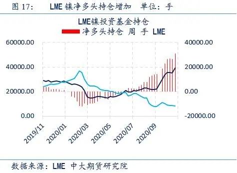 11月份国内精镍库存持续下滑,截至11月20日,国内镍总库存5.18万吨,较10月环比下降0.59万吨,降幅约为10%;而在LME方面,虽然当月伦敦交易所镍库存继续保持稳定,变动不大,但LME镍投资基金净多头持仓持续增加,表明市场对未来镍价走势较为乐观。