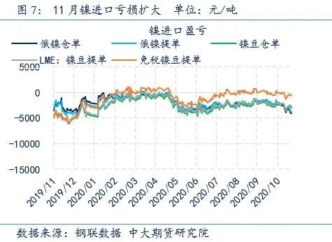 目前甘肃冶炼厂设备检修已接近完成,预计11-12月份产量有望回归月度平均水平,新疆及山东冶炼厂未来排产量预计与前期持平。但是吉林冶炼厂在明年春节前暂无复产计划,这使得国内电解镍产量回升有限,预计11-12月平均产量较10月增长1000吨左右,环比回升约8%。进口方面,11月精镍进口亏损继续扩大,预计纯镍进口数量将保持低位。总体来看,虽然预计甘肃冶炼厂检修结束使得产量回升,但吉林冶炼厂检修及纯镍进口窗口继续关闭,或使得精镍整体供应回升有限。