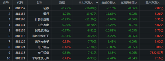 主力资金流出的板块分别是证券、银行、计算机应用,主力资金流出金额分别为16.80亿元、13.97亿元、11.26亿元,其中散户净流入金额为7.02亿元、5.26亿元、3.31亿元。