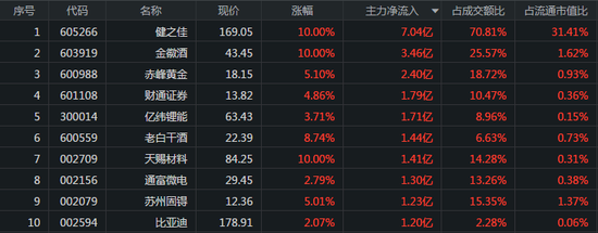 从个股来看,主力资金最青睐的3只股票分别是健之佳、金徽酒、赤峰黄金,流入金额分别为7.04亿元、3.46亿元、2.40亿元,所对应的涨幅分别为10.00%、10.00%、5.10%。