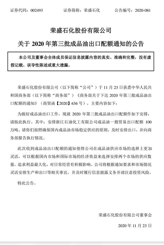 上市公司荣盛石化发布的公告表示,浙石化收到成品油出口配额的通知,使公司在成品油供应市场的选择上更加灵活,可以根据国内市场和国际市场的经济效益来选择安排两个市场的供应数量,追求利益最大化,对日常经营有积极影响。