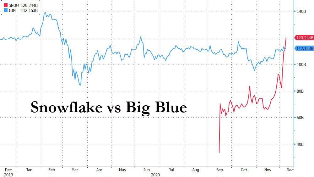 12月8日周二美股盘中,Snowflake一度大涨10%至420美元上方,盘中市值飙升至1200亿美元左右,超过了市值约为1120亿美元的老牌IT公司IBM和市值接近1117亿美元的半导体巨头AMD。