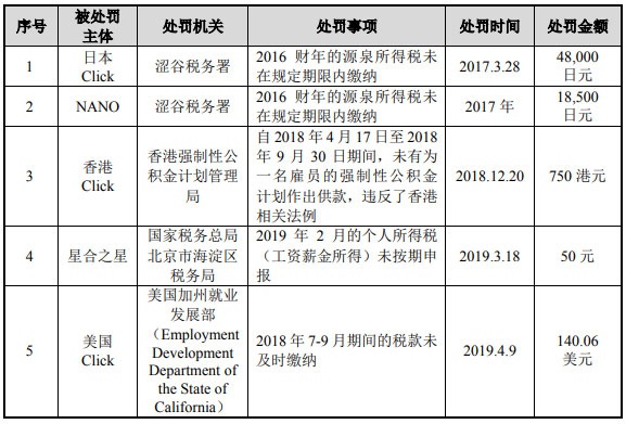 2017年3月28日,因易点天下控股子公司日本Click2016财年的源泉所得税未在规定期限内缴纳,涩谷税务署对日本Click处罚48,000日元。