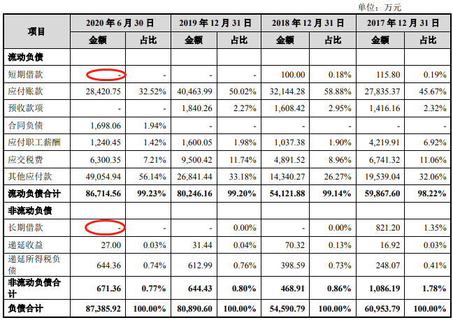 以上同期,易点天下负债合计分别为6.10亿元、5.46亿元、8.09亿元、8.74亿元,流动负债合计分别为5.99亿元、5.41亿元、8.02亿元、8.67亿元,占比分别为98.22%、99.14%、99.20%、99.23%。