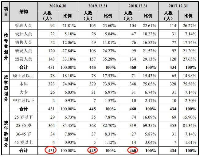 公司最近一年一期员工人数连降。2017年末-2019年末及2020年月末,易点天下员工人数分别为434人、460人、445人和431人。