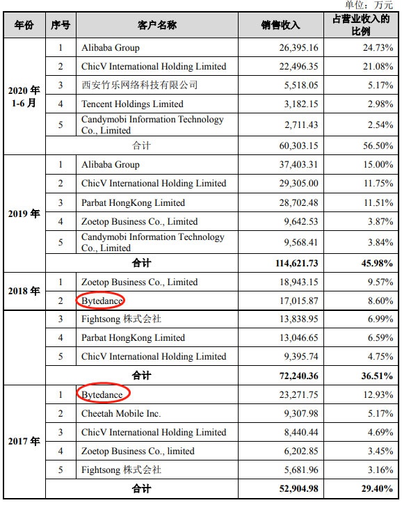 2017年、2018年,Bytedance系易点天下第一和第二大客户,销售收入分别为2.33亿元、1.70亿元,呈下滑趋势。2019年、2020年上半年,Bytedance退出易点天下前五大客户。