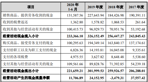 2018年、2019年,易点天下收到现金均不及营收。2017年度、2018年度、2019年度及2020年1-6月,公司营业收入分别为17.99亿元、19.79亿元、24.93亿元、10.68亿元,销售商品、提供劳务收到的现金分别为19.04亿元、18.44亿元、22.76亿元、13.16亿元。