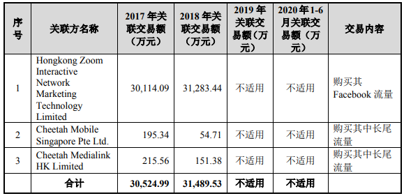 易点天下招股书表示,2017年-2019年及2020年1-6月,CheetahMobileInc与公司发生的交易金额分别为3.05亿元、4.37亿元、2.77亿元和8020.90万元。
