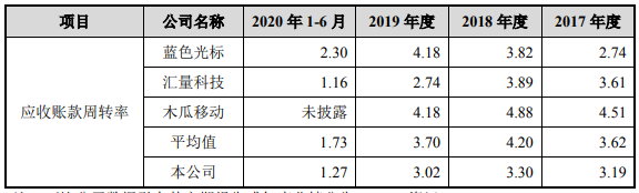 公司应收账款周转率低于同行均值。2017年-2019年及2020年1-6月,易点天下应收账款周转率分别为3.19、3.30、3.02、1.27,同行平均值分别为3.62、4.20、3.70、1.73。