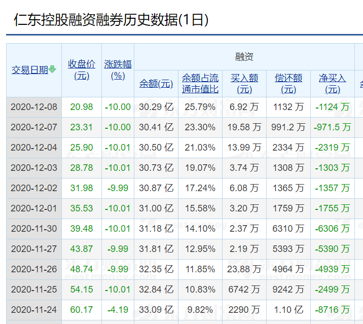 数据显示,截至12月8日,仁东控股融资余额仍超过30亿元。与高企的融资额相比,目前仁东控股的成交低迷,12月8日的成交额约为1052.57万元,12月9日全天成交2000多万元。