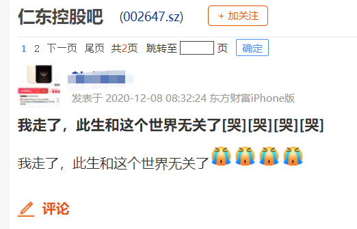 12月8日,一位投资者在仁东控股股吧表示,“融资已经爆仓了,欠券商200万了”。