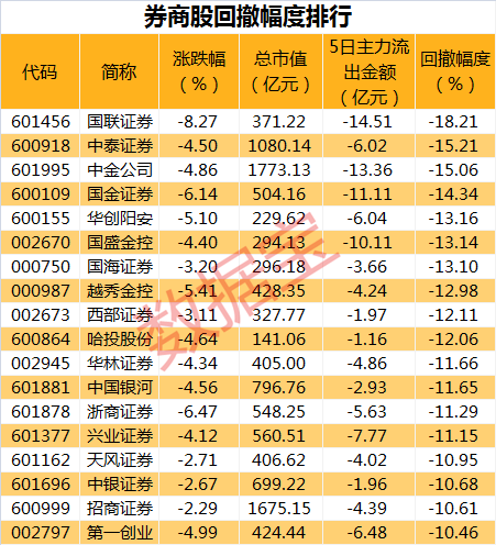前期涨停个股回撤幅度同样居前,最新价较最高价回撤幅度均超过10%,国联证券回撤18.21%居于首位,中金公司、中泰证券回撤超过15%,另有15只券商股回撤超过10%,前期涨幅尽数回落。