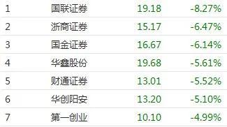 今日券商股尾盘集体跳水。截至收盘,券商板块下跌3.44%,在二级行业中位列倒数第五。国联证券早间微有上涨,尾盘却急速下挫,一分钟内下跌3.14%,收盘报跌8.27%。浙商证券、国金证券、华鑫股份等6只个股等也在尾盘下行,跌逾5%。国联证券、国盛金控(维权)全天振幅均超过10%,另有8只个股振幅超过7%,15只个股振幅超过5%。