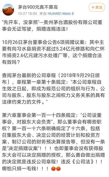 正是后两起捐款,引起了茅台小股东“茅台900元真不算高”(微博昵称)的质疑。