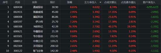 从个股来看,主力资金最青睐的3只股票分别是通威股份、海康威视、澜起科技,流入金额分别为4.02亿元、3.39亿元、3.34亿元,所对应的涨幅分别为8.65%、2.95%、5.48%。