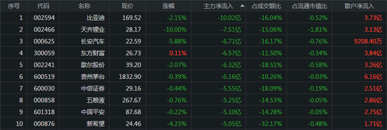 比亚迪、天齐锂业、长安汽车分别遭主力资金卖出10.02亿元、7.15亿元、6.71亿元。