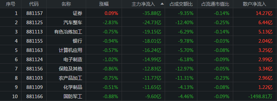 主力资金流出的板块分别是证券、汽车、有色,主力资金流出金额分别为35.88亿元、24.73亿元、19.15亿元,其中散户净流入金额为14.27亿元、6.44亿元、5.13亿元。