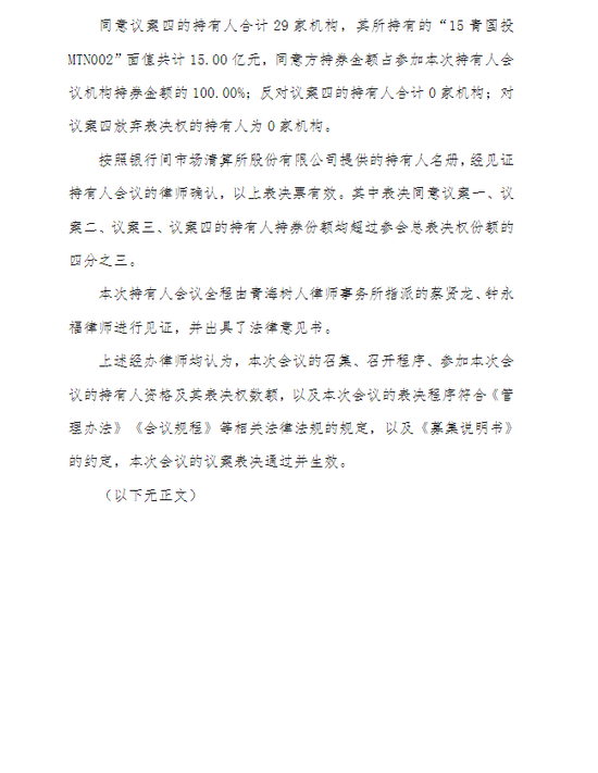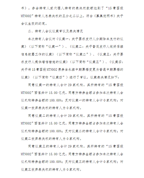 “15青国投MTN002”持有人会议全票通过分期除本兑付等议案