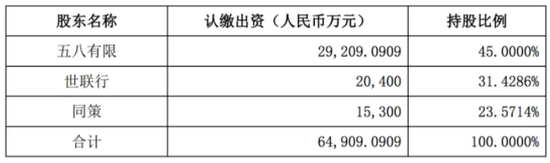 转让前,上海更赢由五八、世联行和同策分别持股45%、31.4286%和23.5714%,且三方的认缴出资额分别为2.92亿元、2.04亿元和1.53亿元,合计注册资本为6.49亿元。