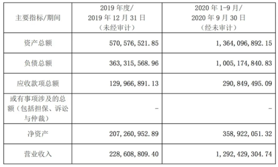 截止2019年底,上海更赢总资产5.7亿元,总负债3.63亿元,应收款项总额1.30亿元,净资产2.07亿元,营业收入2.28亿元,净利润-9573万元,经营活动产生的现金流量净额-1.22亿元。
